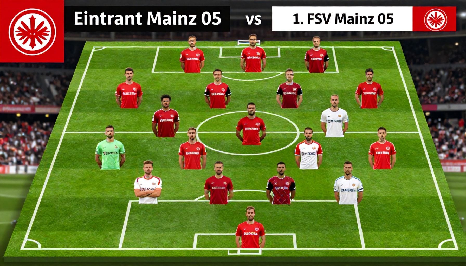 Mainz 05 antwortet mit einer 4-2-3-1 Formation, angeführt von Trainer Bo Svensson. Florian Müller hütet das Tor, unterstützt von der Abwehr mit Andreas Hanche-Olsen, Moussa Niakhaté, Alexander Hack und Aaron Martin. Das defensive Mittelfeld bilden Aurelio Butic und Daniel Brosinski, während die offensiven Mittelfeldspieler mit Levent Aycicek, Anthony Caci und Marcus Ingvartsen für Dynamik sorgen. Der Stürmer Adam Szalai führt die Angriffsbemühungen an.